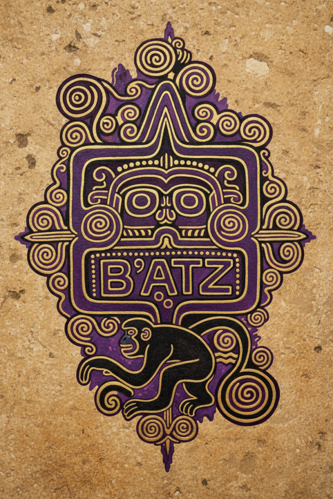 B’atz es el hilo del tiempo donde están escritos todos los acontecimientos desde el principio de los tiempos. También el hilo que nos une a nuestra madre: el cordón umbilical. Es el artesano, el artista, el consejero, el maestro.